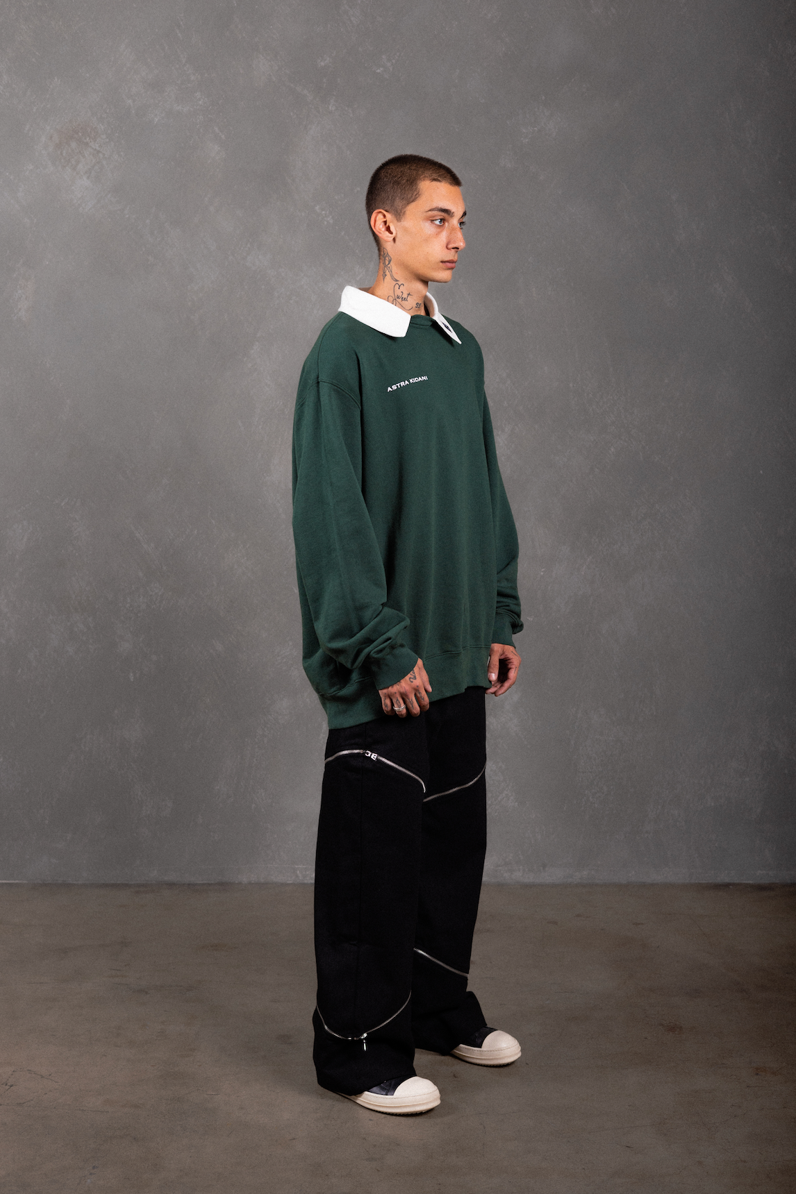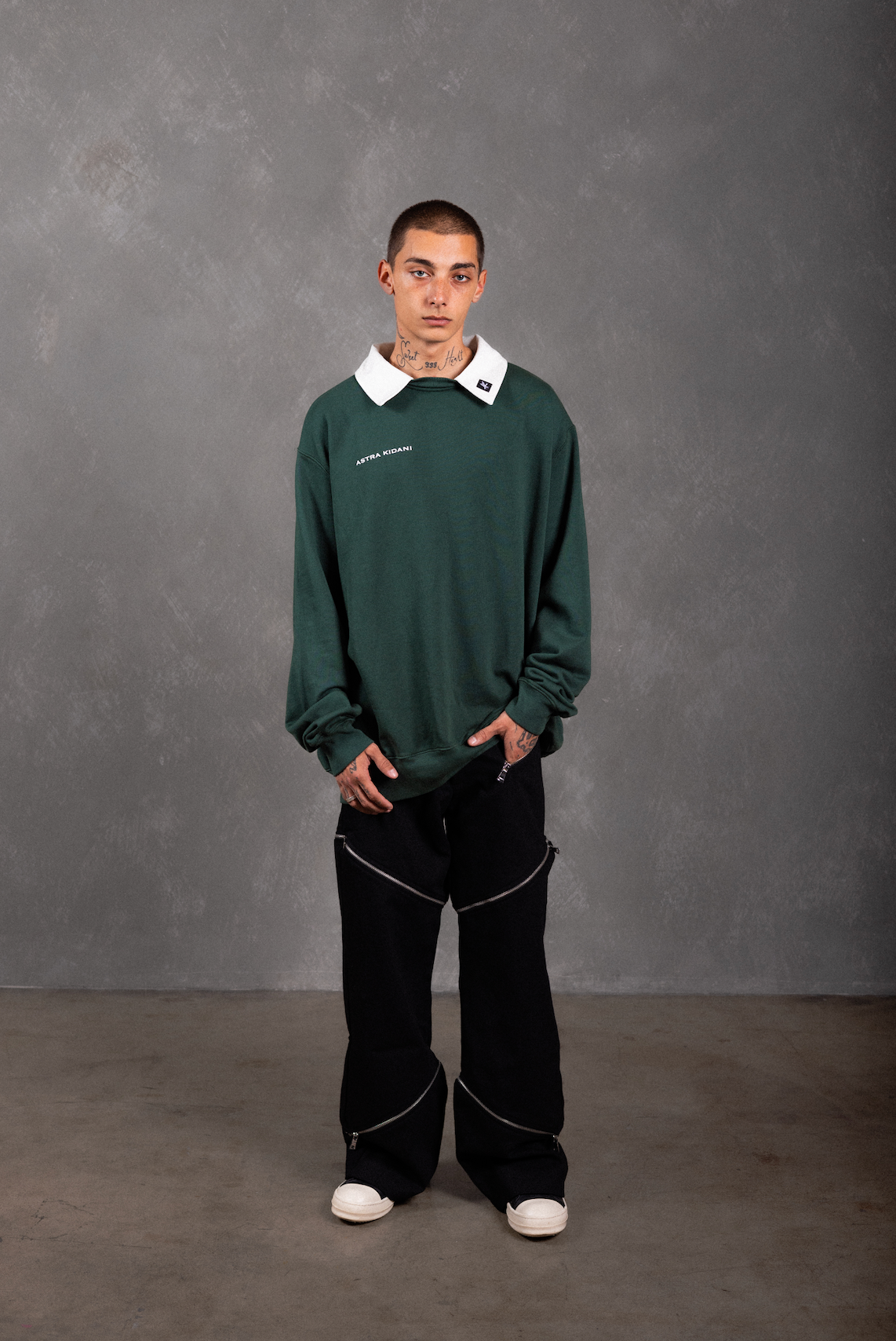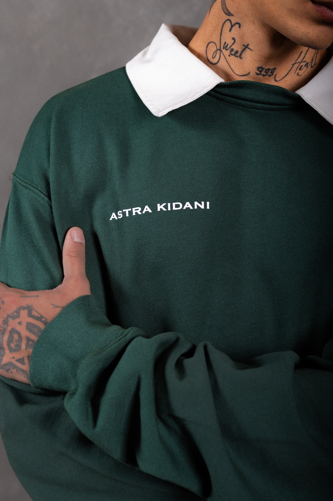 The "SIGNATURE COLLAR CREWNECK" in color FERN. Printed signature "ASTRA KIDANI" logo on wearer's right chest. Elastic cuffs and hem. "AK" patch on collar.